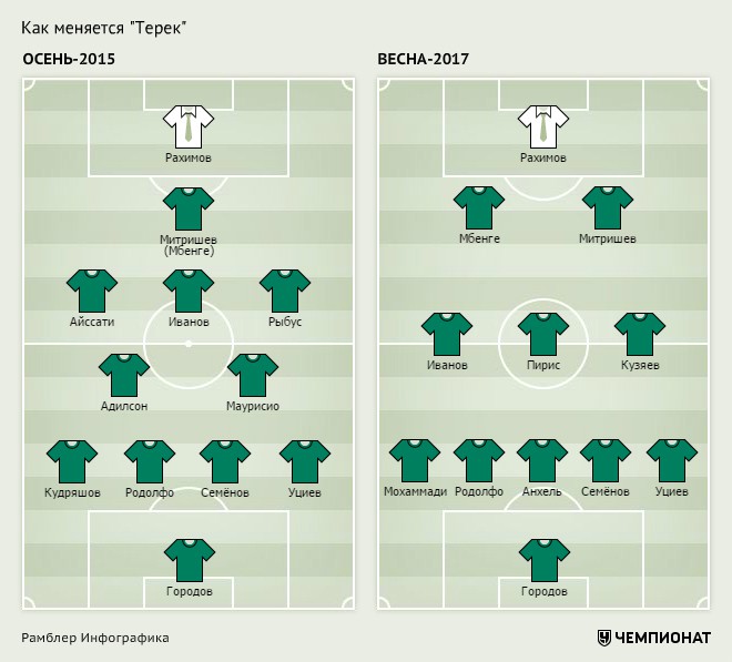 «Терек» стал ещё одной командой Премьер-Лиги, перешедшей на схему в три центральных защитника. Сам по себе модуль 3-Х-Х не оборонительный, и «Ювентус» доказывает это сезон за сезоном, но в России тактика стала средством достижения результата при недостатке мастерства игроков атаки. Первым к использованию 3-Х-Х пришёл Курбан Бердыев, следом – Гаджи Гаджиев в «Амкаре». Мотивация Рахимова – та же, о чём тренер «Терека» говорил на днях: «Раньше имели хороший контроль мяча. Опорная зона состояла из таких футболистов, как Маурисио, Адилсон. Плюс были ещё Рыбусь, Айссати. Сегодня у нас другие игроки. И нужно стараться выжимать из них максимум».