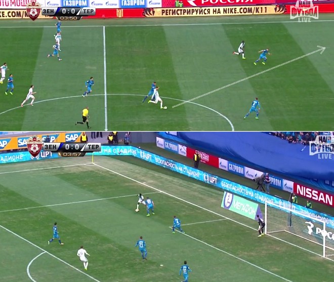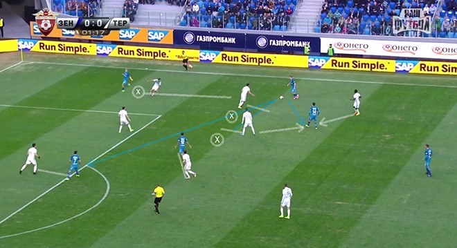 При обороне схема «Терека» – чистые 5-3-2. Целенаправленно взламывать команды с такой тактикой в России не научились, и «Терек» доказал тезис в Санкт-Петербурге, против команды, которой сложнее всех даются матчи против соперников с таким модулем. Взломать пятёрку защитников пасом вразрез очень сложно, поэтому «Зенит» предпочитал развивать атаки через фланги. Однако здесь крылась ловушка для «Зенита»: «Терек» отодвигал атаки сине-бело-голубых на край, навязывал прессинг и вынуждал или отдавать назад, или бездумно вешать в штрафную. В прессинге участвовали и крайний центральный полузащитник, и ближний к флангу нападающий.