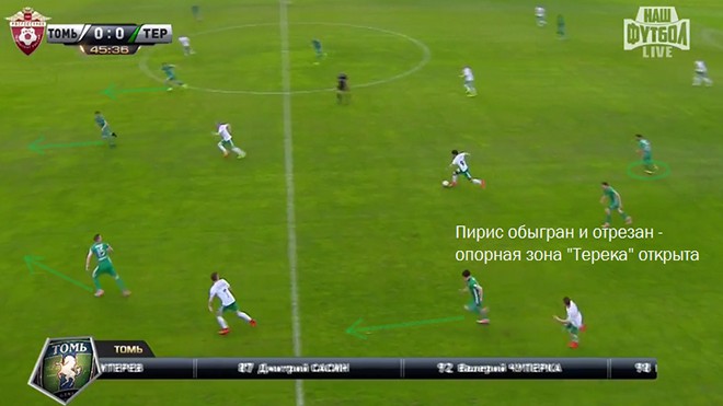 Типичная ситуация: Шатову перекрыты все варианты передач. Смольников уже забежал в офсайд, Юсупова готов прессинговать Мбенг, линию передачи на Данни готов перекрыть Лебеденко. Пирис выдвинулся на Шатова и перекрыл сразу две линии передач.