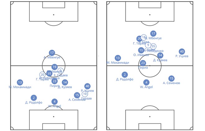 Важный и любопытный момент – при схеме с тремя центральными защитниками Рахимов обязательно использует одного креативного полузащитника на линии с Мбенге, второго – в глубине. Только за последние два матча в обоих ролях успели поиграть Иванов, Торже и Лебеденко. У «Терека» есть предпосылки к использованию в атаке схемы 3-4-3, но пока на тепловых картах заметно, что один из креативных игроков всё ещё глубже привязан к полузащите.